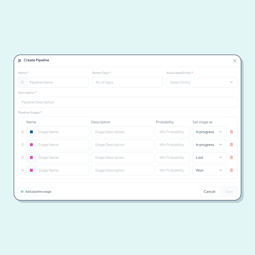 Customise fields, pipelines, and dashboards without writing a single line of code. Perfect for startups that need speed, not technical setup.